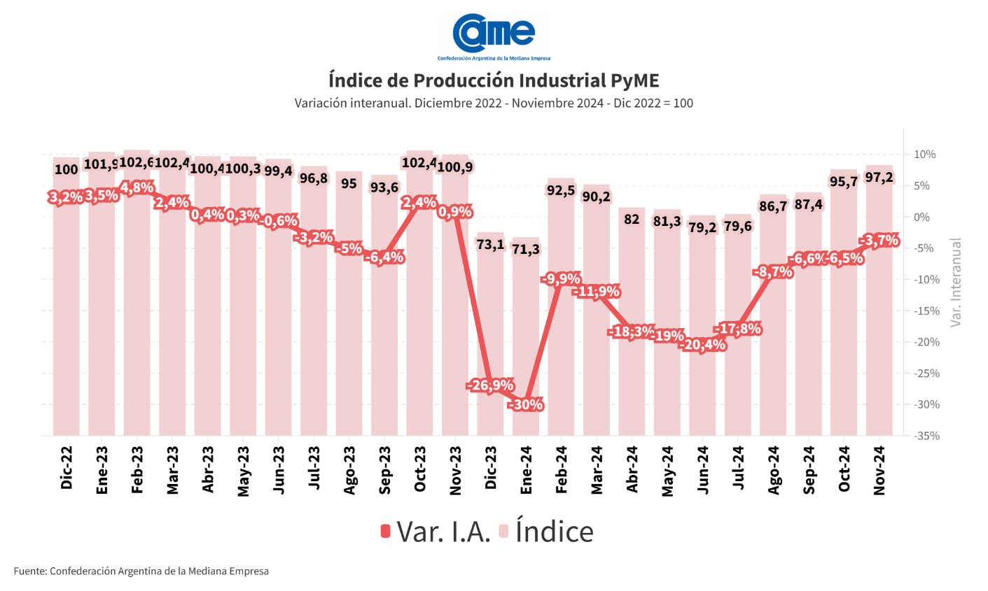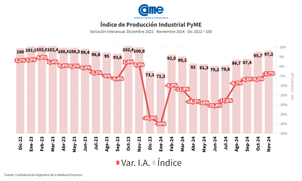 – La actividad manufacturera de las pymes descendió 3,7% anual en noviembre