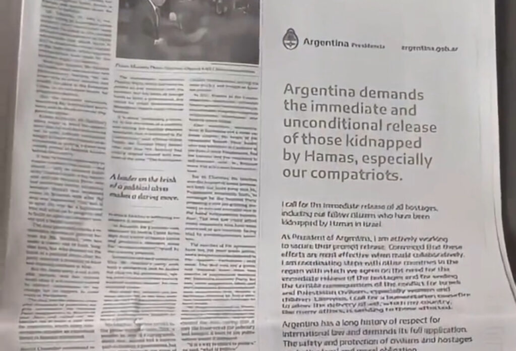 Es parte de una acción global que reclama la inmediata e incondicional libertad de las víctimas secuestradas por el accionar terrorista del Grupo Hamas, en particular las argentinas. pic.twitter.com/35JwxqvDwL